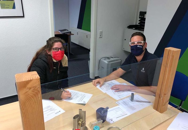 Unser Personaldisponent Thorsten Klata geht mit unserer neuen Mitarbeiterin Chantal noch einmal den Vertrag durch.